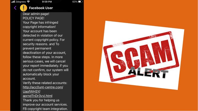 I've pasted most of the text in the picture above - it was trying to suggest that I'd breached copyright somehow and the FaceBook team were about to block the account. I could see this being effective for three reasons - firstly, the concept of copyright is a thing that everyone seems to understand, even my kids know about it for some reason. Secondly, in the opaque world of FaceBook, where people quite often re-post things, and lots of people are managing business accounts as well, and the processes and the rules are frequently changing, it's almost plausible that one might have made such a mistake. And thirdly, it's also plausible that Facebook might target a user wrongly, or that another user could report you maliciously. And it's basically impossible to contact Facebook to request a remedy.