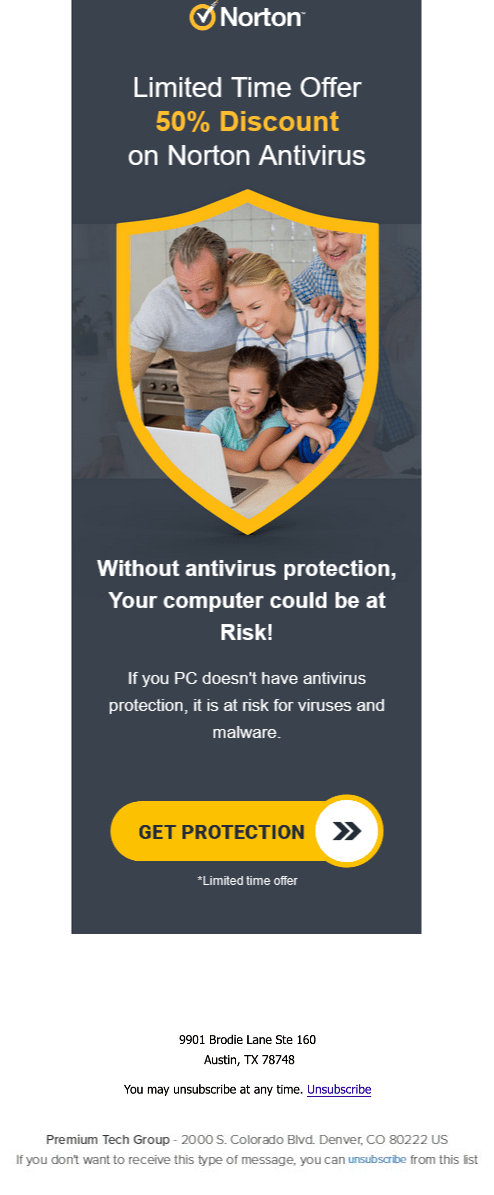 - Urgency or threats (50% off for a limited time, Without antivirus protection you computer could be at Risk!)